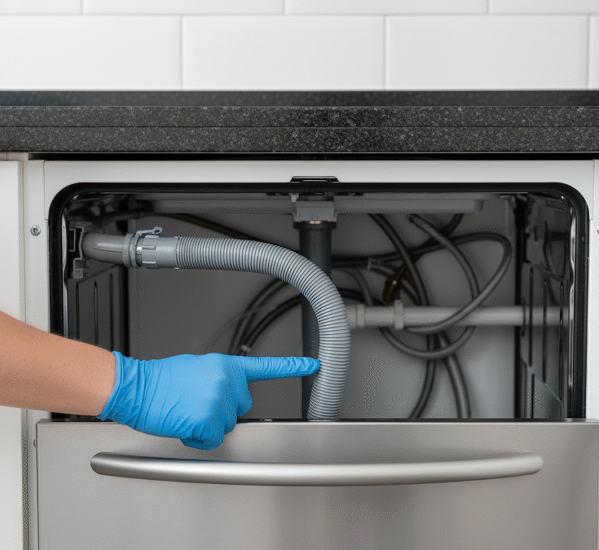 • روش عیب‌یابی و رفع: ماشین ظرفشویی را کمی جلو بکشید و مطمئن شوید که شلنگ تخلیه در پشت دستگاه خم نشده یا تحت فشار نیست. همچنین، اگر شلنگ قدیمی و فرسوده است، ممکن است نیاز به تعویض داشته باشد.